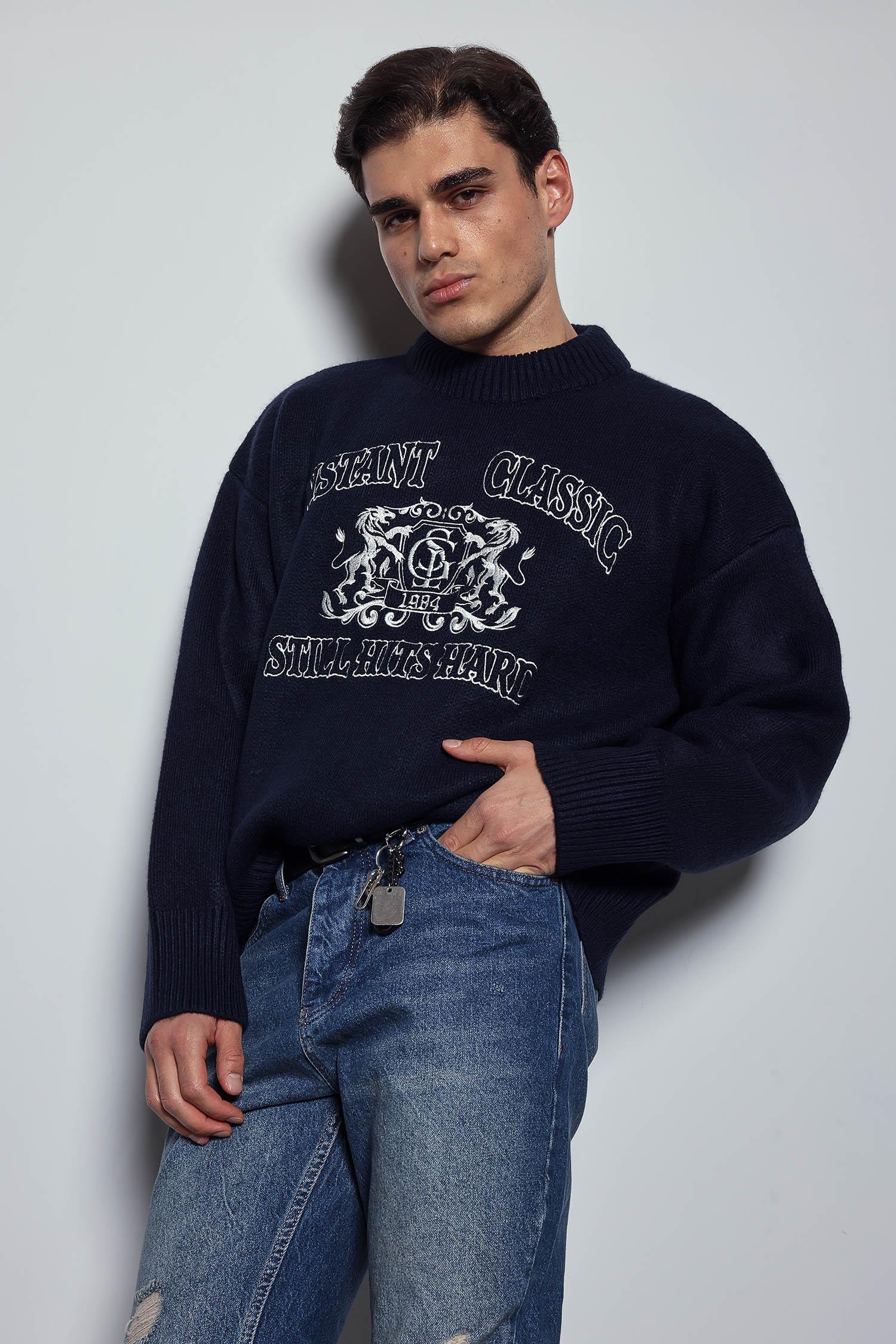 Erkek Oversize Bisiklet Yaka Nakışlı Triko Kazak Lacivert
