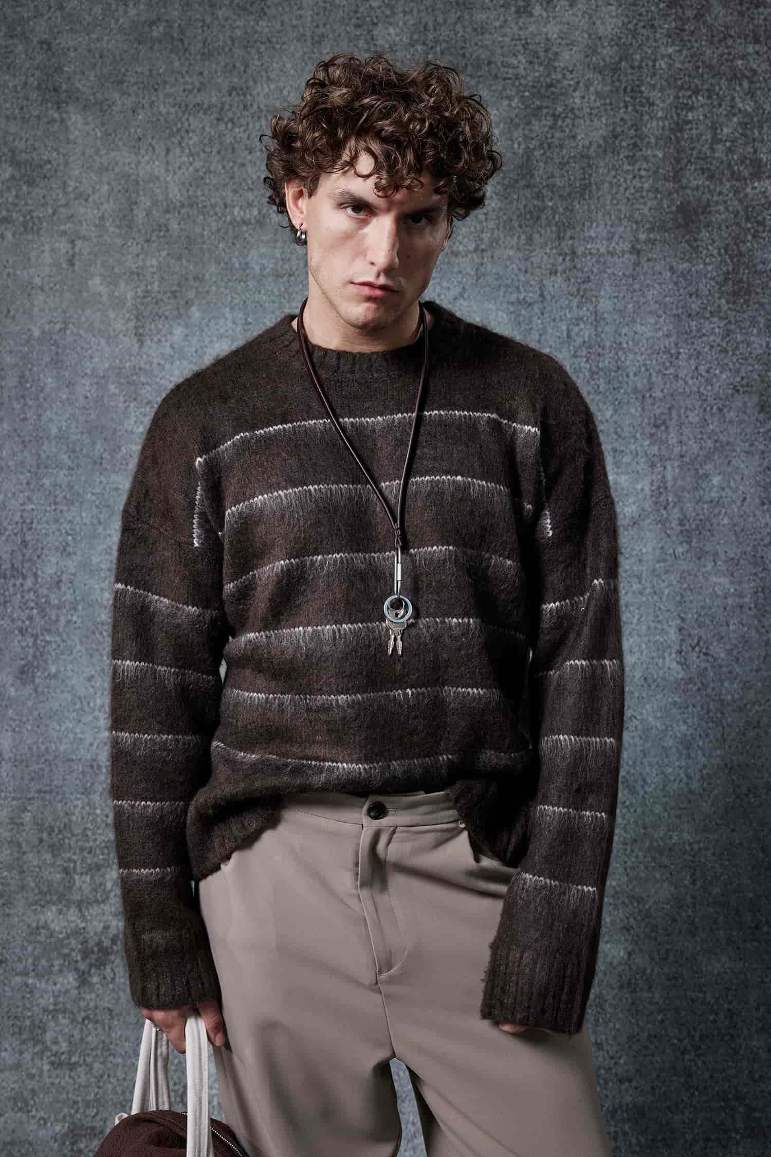 Erkek Oversize Çizgili Tüylü Triko Kazak Kahverengi (KZK.0092)
