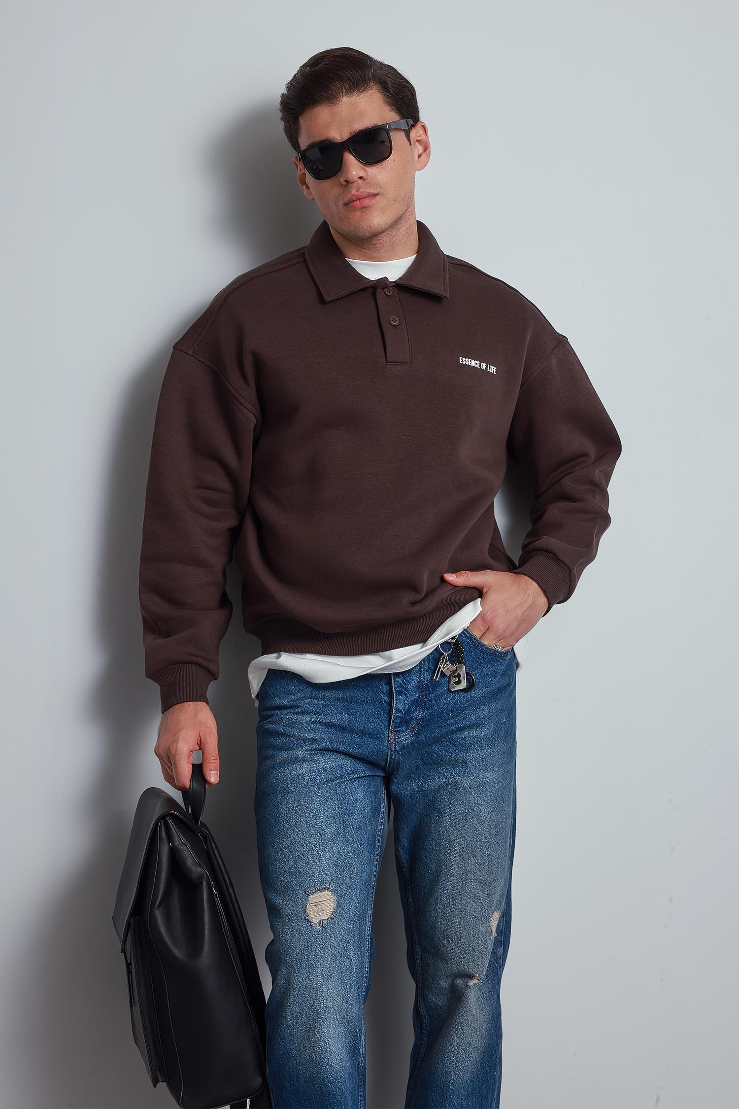 Erkek Oversize Düğmeli Polo Yaka Sweatshirt Kahverengi (SWT.0101)
