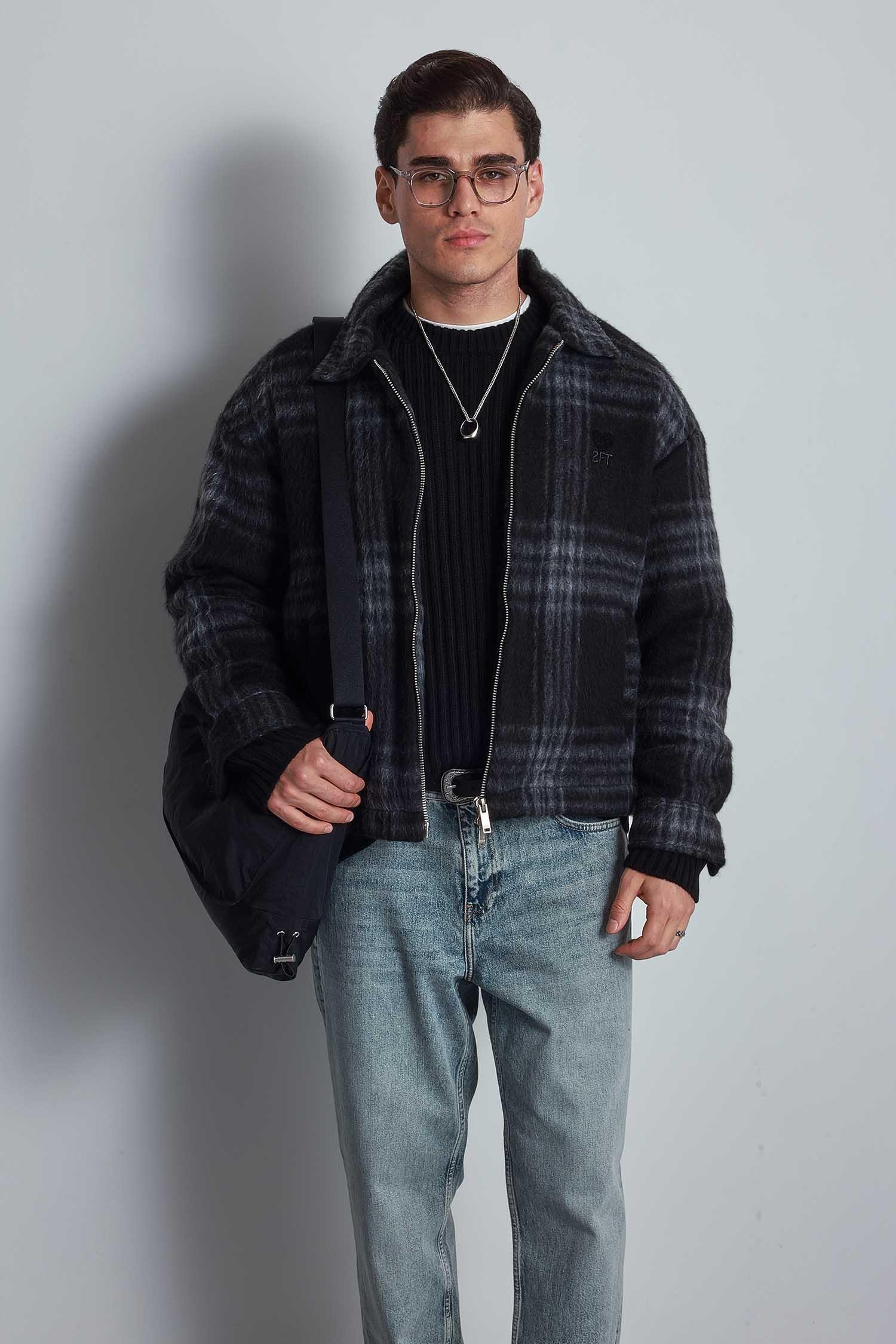 Erkek Oversize Fermuarlı Ekose Desenli Ceket Siyah
