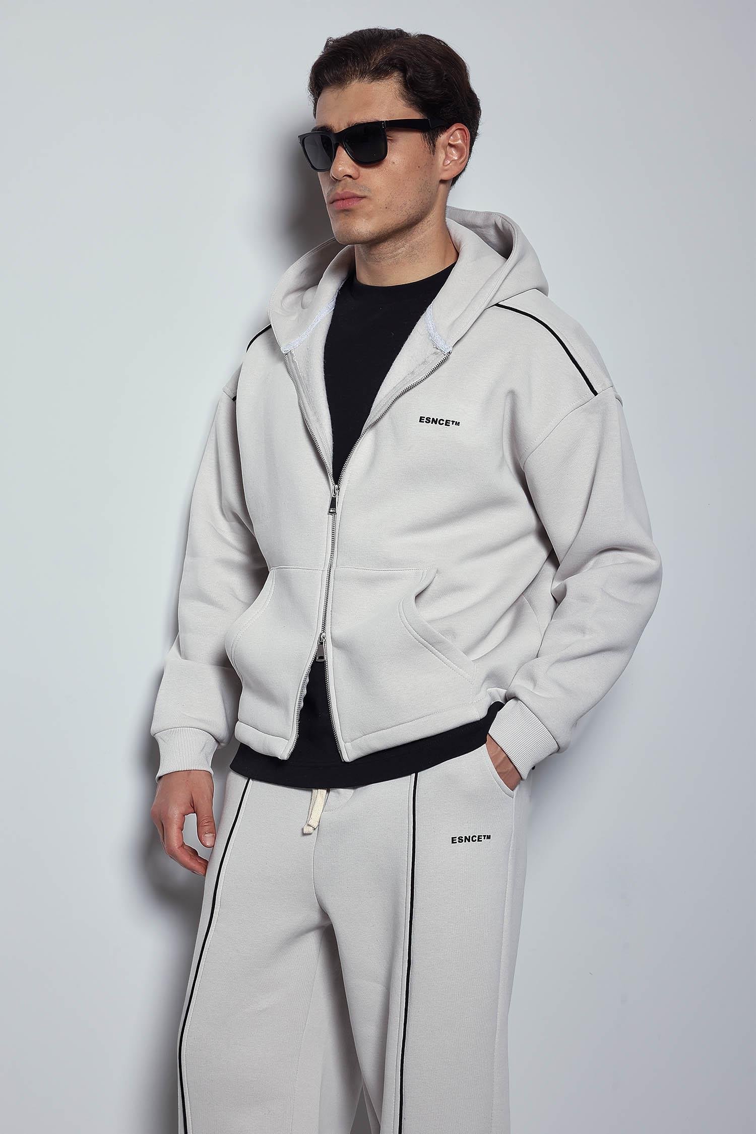 Erkek Oversize Fermuarlı Kapüşonlu Eşofman Takımı Gri