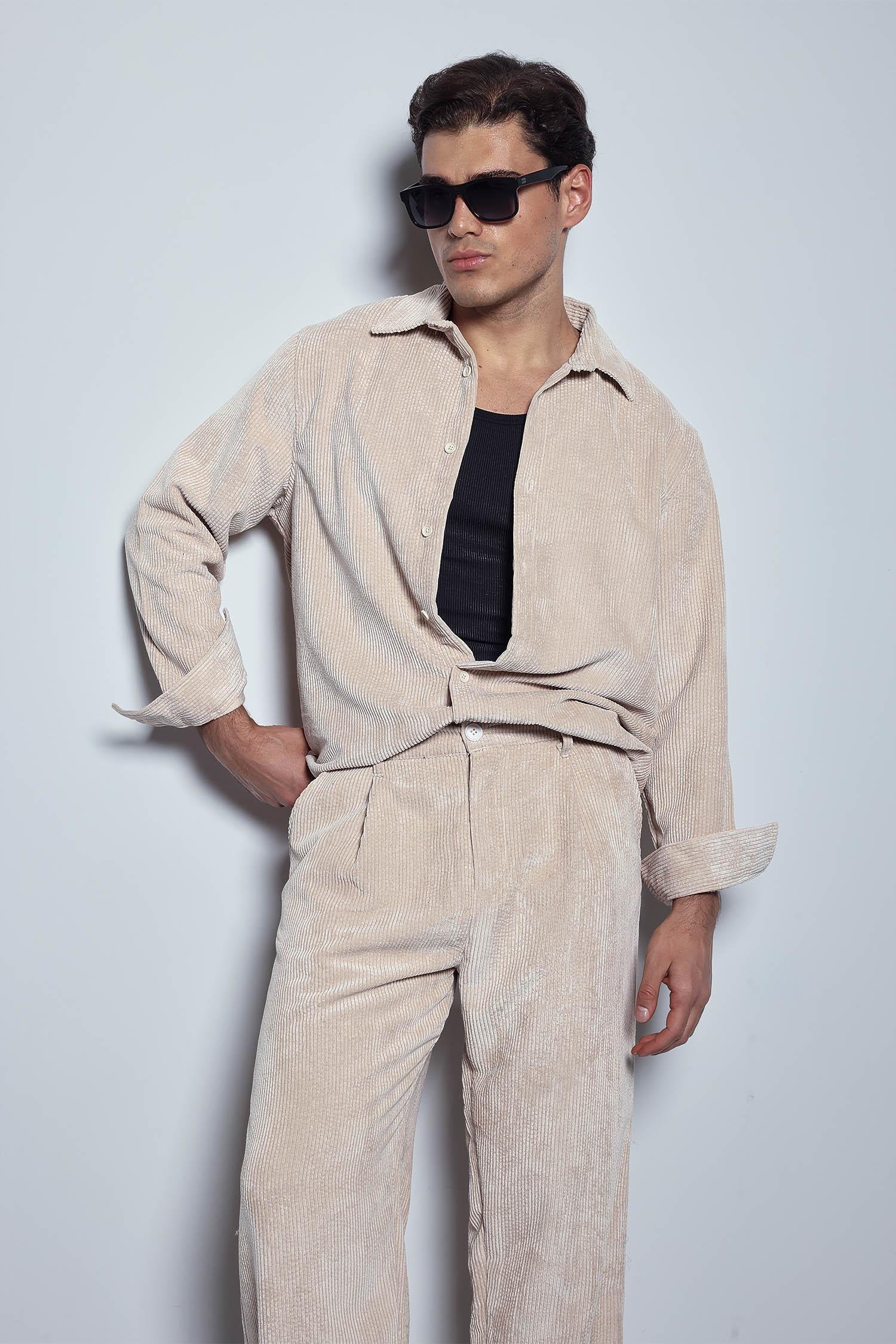Erkek Oversize Kadife Dokulu Uzun Kollu Gömlek Taş Rengi (GML.0176)
