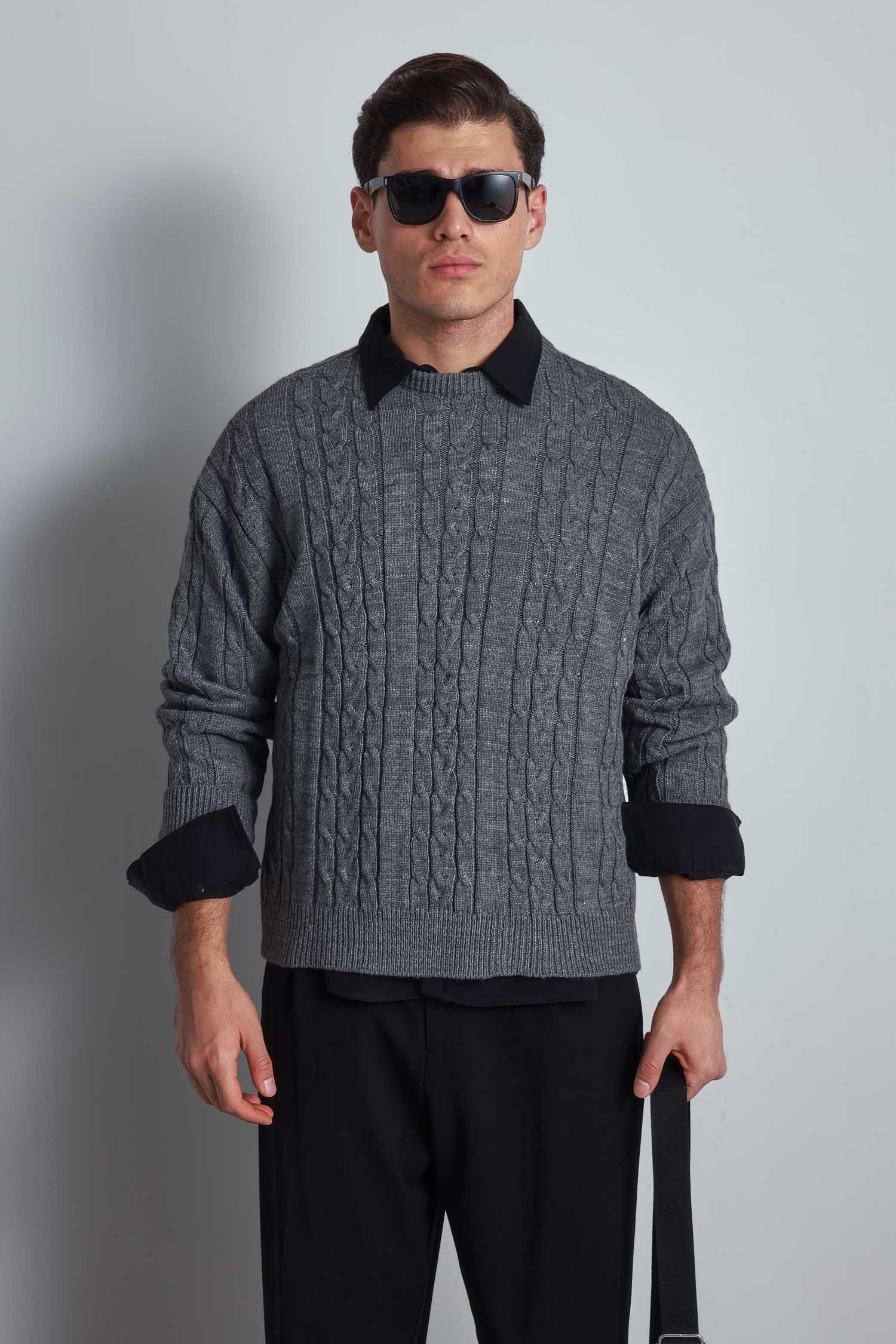 Erkek Oversize Örgü Desenli Triko Kazak Gri (KZK.0080)