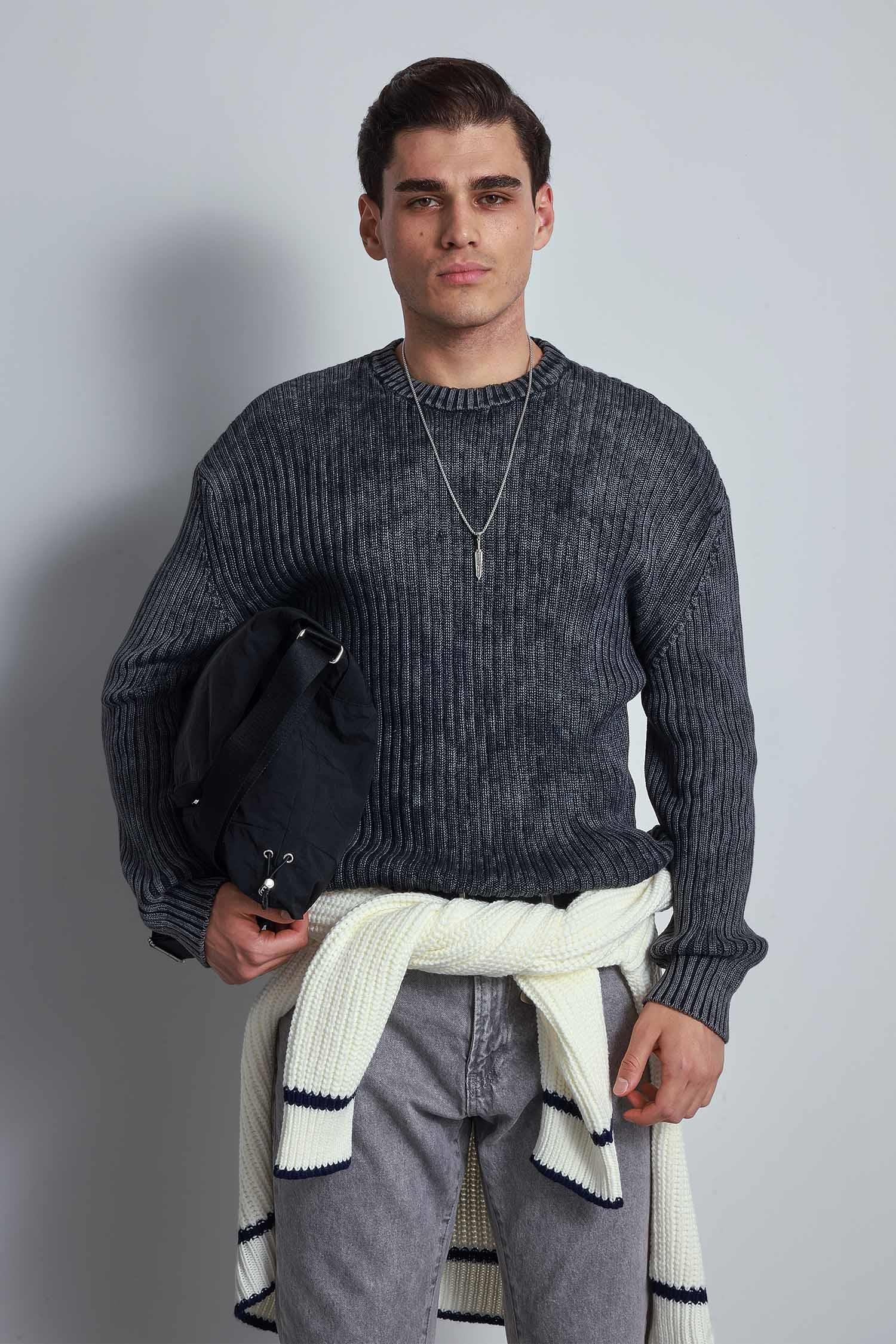 Erkek Oversize Yıkamalı Efektli Basic Kazak Siyah (KZK.0075)