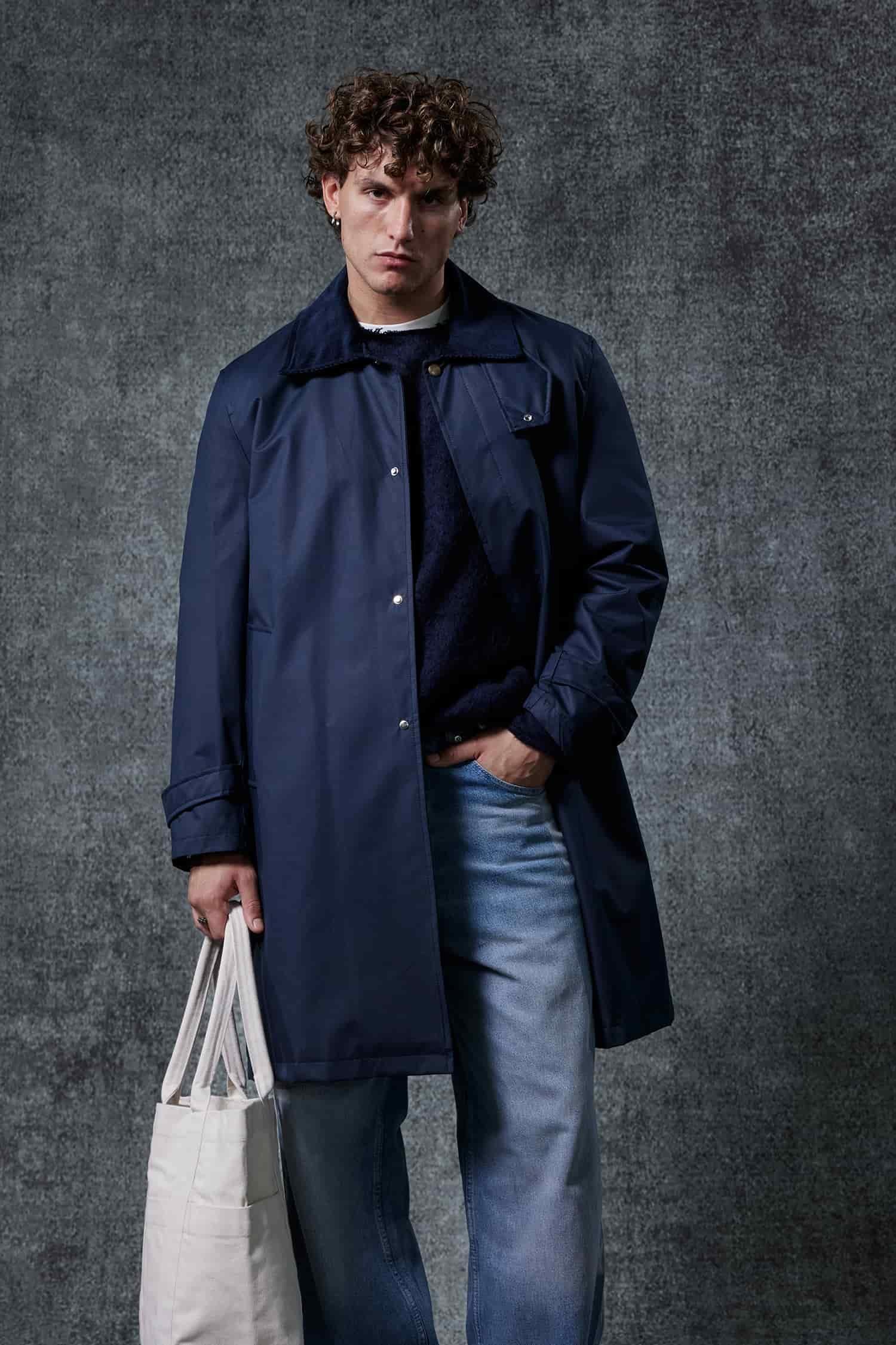 Erkek Relax Fit Kadife Yaka Detaylı Uzun Trençkot Lacivert (TRC.0004)