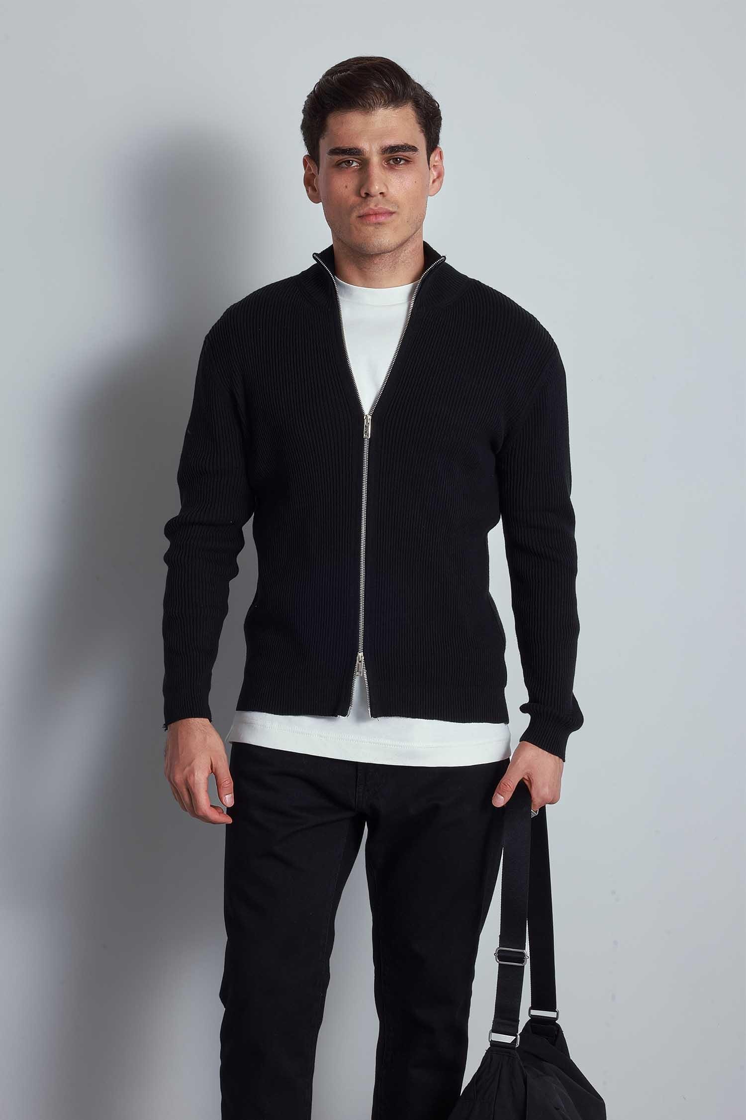 Erkek Slim Fit Dik Yaka Fermuarlı Hırka Siyah (HRK.0006)