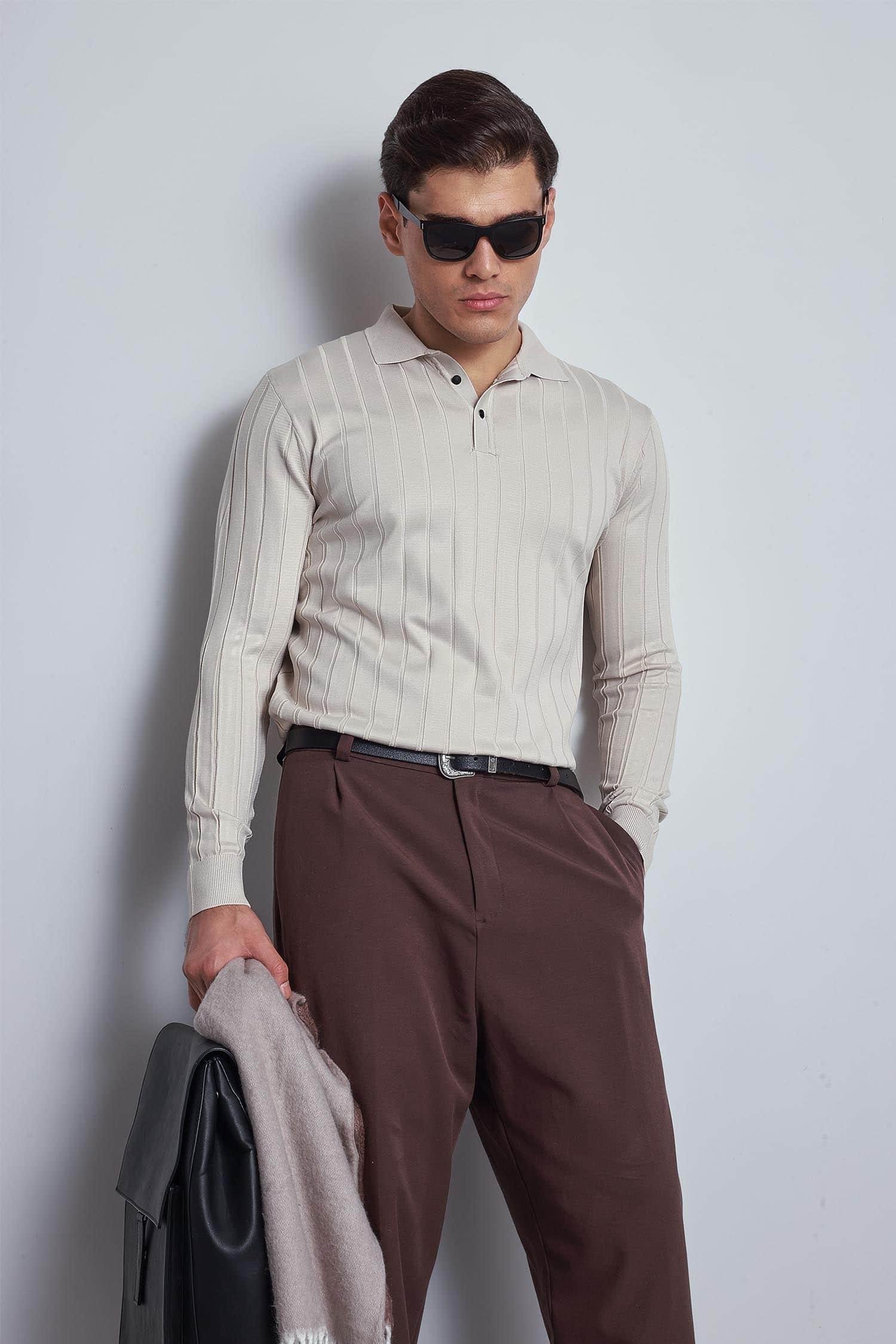 Erkek Slim Fit Premium Kumaş Polo Yaka Düğmeli Kazak Taş (KZK.0077)